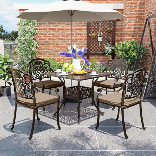 ?Durable Outdoor Furniture?Our patio table and chairs set is crafted from high - quality cast aluminum. This patio dining sets' material offers outstanding rust - resistance and performs steadily in harsh weather, from summer heat to winter cold and rainy - season humidity.Moreover, it's incredibly easy to maintain. A simple wipe is usually enough to keep it looking clean and new. The sturdy construction ensures long - lasting use, making it a reliable choice for decorating your outdoor space and enjoying outdoor dining.