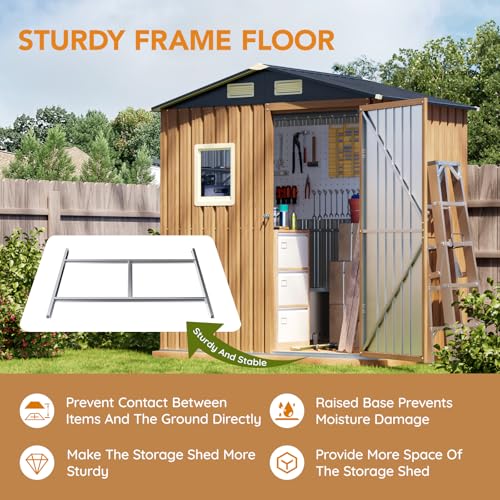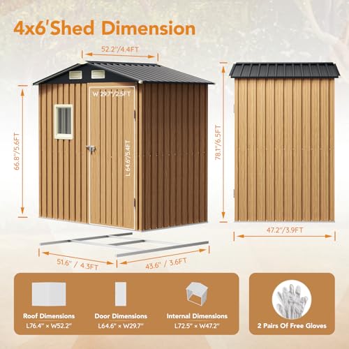 [Multiple Uses] Panovue outdoor metal shed is not only a 6 x 4 FT metal garden storage shed, but an open and uncluttered garden. 130 cubic feet of storage to store garden tools like shovels, lawn mowers, ladders, or outdoor items like bikes, tents to keep your garden or yard organized.Our shed has scientific height design-Max height is 78.1 inch,which for most people can stand inside.The shed is equipped with a frame floor, so you don't need to purchase one additionally.