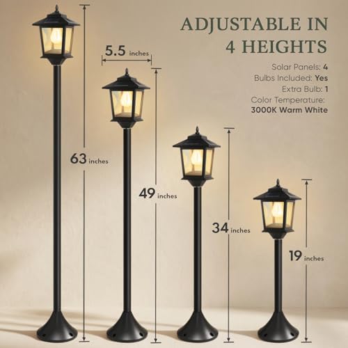 ?Wide Usage & Decorative?With Warm White Edison Bulb and a height of 63 inches, the solar lamp post light is a great addition to your flower gardens. It's also a nice little guiding light at the end of your patio. Solar pole lights outdoor can be placed in Backyards, Porches, Pathway, Front/Back Door. Solar light poles for outside will bring you different decoration experience.