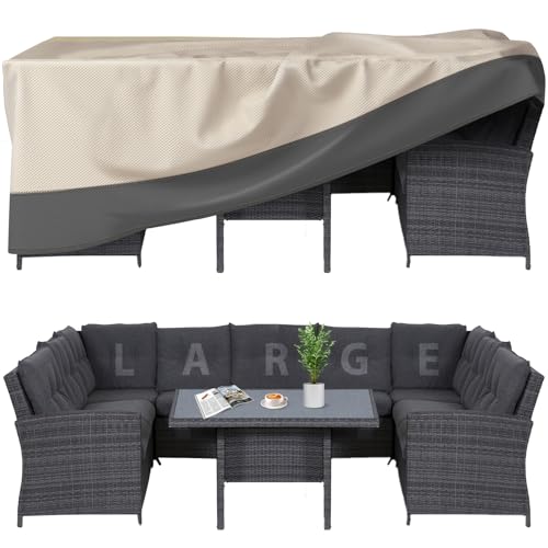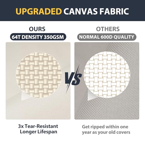 ?TRULY PREMIUM MATERIAL? We could promise your luxury furniture keep dry and clean in all harsh weathers. Unlike others, our ultimate-version patio furniture covers are crafted from 600D 350GSM 64T densitycanvas oxford fabric, making the cover itself highly resistant to tear and water, won't weaken over the years of use. The upgraded PVC coating is heat and cold-resistant, ensuring never melt or stick to your furniture in summer, and no peel in winter.