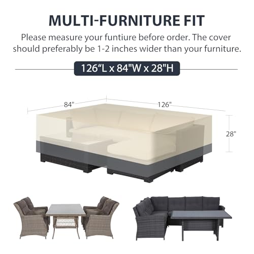 ?FURNITURE FIT RANGE?This extra large rectangular patio cover measures 126 inches x 84 inches x 28 inches . It fits most furniture such as 1-2 dining tables, benches, couches, rectangular or oval patio dining sets, 8-12 chairs, or 6-8 seats sofa sets. Please measure the size of your furniture set before purchase.