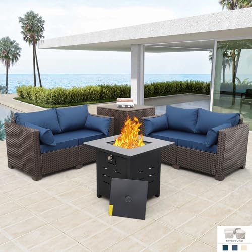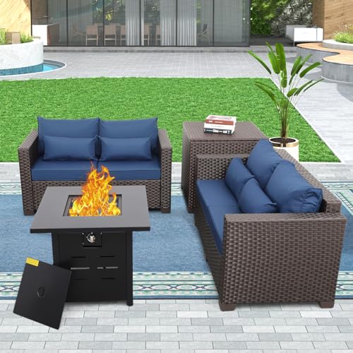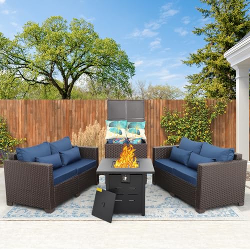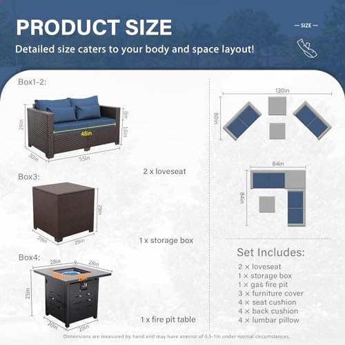 Comfortable and Anti-Slip: This patio furniture with a fire pit is equipped with thickened seat cushions (4 inches), high resilience sponge, and anti-slip plastic fabric on the bottom to keep the cushions from slipping while matching padded cotton back cushions for comfort and durability. In addition, 4 lumbar pillows are included as gifts