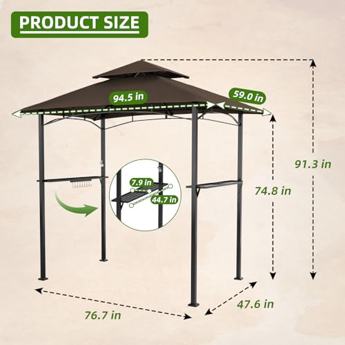 ??Unique Design?The grill gazebo has a steel mesh rack on each side for barbecue accessories, drinks and food. There are fixed hooks at the bottom of the shelf, which can be convenient for you to store kitchen utensils, umbrellas, etc.