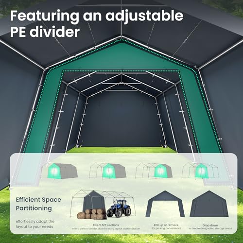 Removable Rollup Dualzipper Doors: Easy access and better visibility. The doors with double zippers and buckles can be removable or rolled up. Doors at the front and back of the storage shelter for easy entry and exit, better visibility and facilitate air circulation.