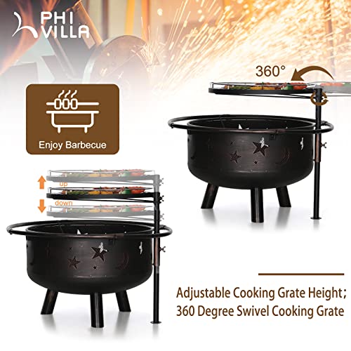 2 in 1 Outdoor Fire pits: PHI VILLA 30 inch wood burning fire pit equipped with a grill grate which can swivel 360 degree, adjusts up and down, swing left or right. You can cook your food easily or take it apart