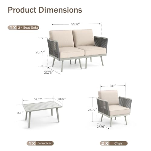 ?Dimensions & Strong Weight Capacity?This rope wicker patio conversation set includes a single L-shaped sectional with overall dimensions of 79.13"(L) x 55.12"(W) x 26.77"(H), along with a spacious coffee table measuring 39.37"(L) x20.87"(W) x 18.31"(H).Each seat supports up to 350 lbs, offering a perfect combination of comfort, functionality, and structural stability for your outdoor space.