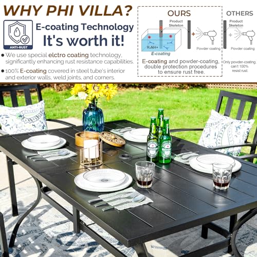 Large Metal Dining Table: Thick slated metal dining table, made of ecoating processed strong steel, rust and weather resistant. Skid resistant feet for uneven ground, comes with 1.57” umbrella hole, more practicable. Dimension: 60L x 38W x 28H.