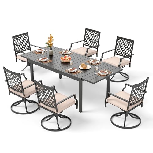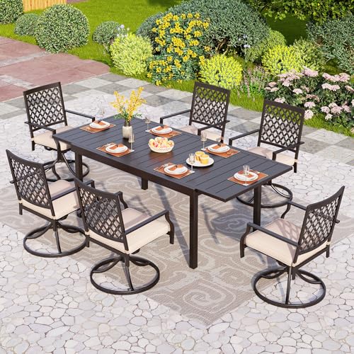 6 Chairs: Full height 35.04", with 2.7" padded cushion, seat width 21.45", seat depth 25", provide a comfortable seat space for different body size. Powder-coated steel frame, load Capacity is 300+ lbs;This swivel chair made of sturdy metal steel frame seat panel reticulated with rust resistant powder coating and easy to clean water resistant padded cushion.