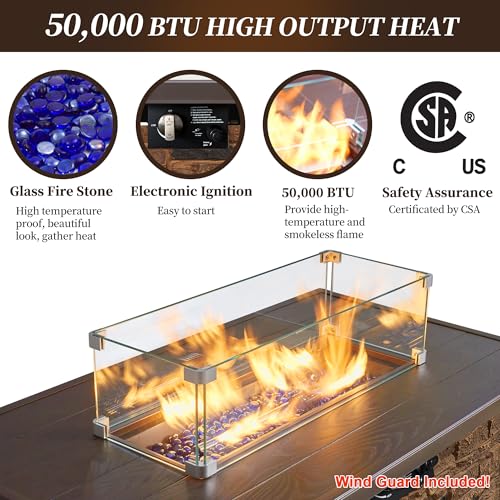 ???? [What's in the box ] FIRE PIT TABLE*1, Size 43"x23"x24.8". GLASS WIND GUARD*1, Size 23.6"x9.3"x4". 8 LBS FIRE GLASS STONES*1. PROTECTIVE COVER*1. REMOVABLE LID*1. We always put customers' satisfaction first and provide a 12-month warranty. Please feel free to contact our customer service team any time before and after purchase, we will respond within 24 hours to solve your question.