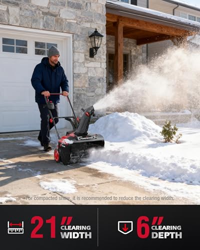 SNOW CLEARING CAPACITY: 21" clearing width, 6" ideal snow depth, and up to 30' snow throwing distance.