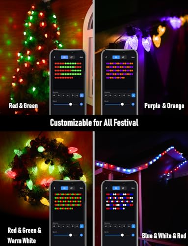 Customizable C9 Christmas lights outdoor : Probro Christmas lights allows you to virtually draw effects on your holiday decorations with your finger via the Hello Fairy app. Ability to choose purple, orange, red, white and 16 million colors for individual bulbs to spice up your Halloween decorations, thanksgiving and Christmas decor. Let your imagination run wild with customizable C9 color changing string lights to create the ultimate in decorative lighting.