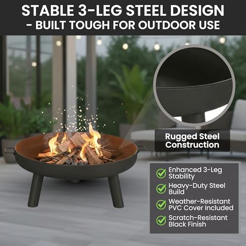 DURABLE BUILD - Rely on the patio fire pit for long-term durability and sturdiness. The sleek 3-legged design and rugged steel construction make this fire pit stable and tough, while the PVC cover provides protection from the elements.