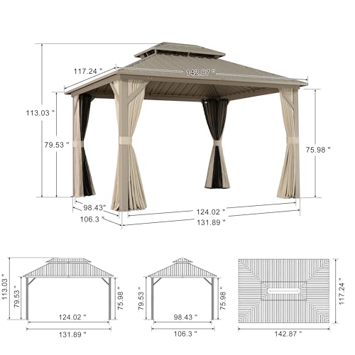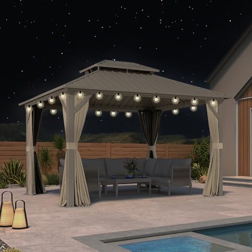 PURPLE LEAF 10' x 12' Outdoor Hardtop Gazebo, Champagne Aluminum Frame with Galvanized Steel Double Roof, Curtains and Netting for Patio Lawn and Garden