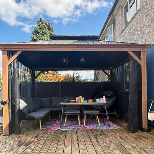 Size: 10' X 12'. Outstanding teak-finish powder-coated aluminum frame, sturdy for 4 seasons use and always catch your eyes.