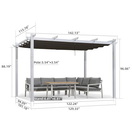 Stable Design: Crossed post and beam construction, the four 6.7 x 6.7 inches wide aluminum feet with pre-drilled holes can help the Retractable Pergola stand stably on ground surfaces