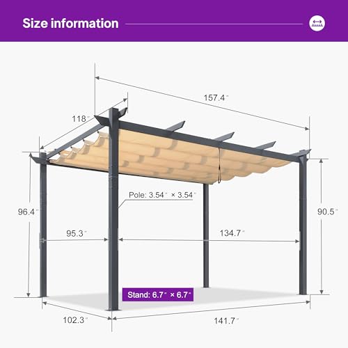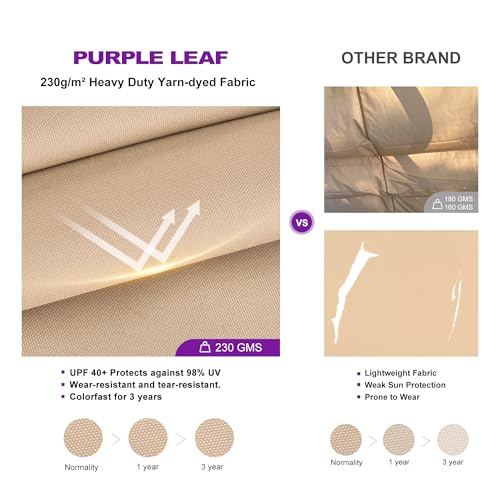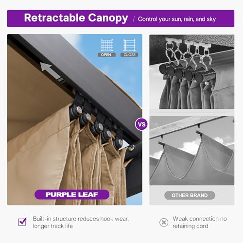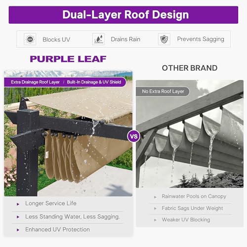 Sturdy Aluminum Frame: The PURPLE LEAF aluminum pergola features craftsmanship for enhanced stability. With thick 3.55-inch rust-resistant aluminum posts, engineered for strong wind resistance and enhanced weather durability, ensuring long-lasting performance.