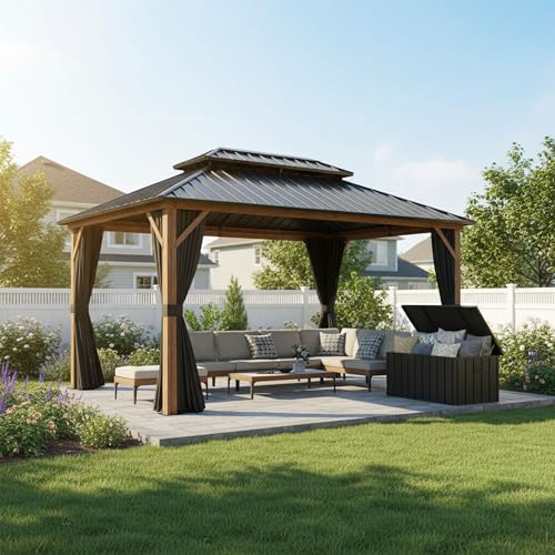 Package Includes: One 10'x14' wood-grain gazebo and one 100-gallon storage box. The deck box measures 49.41"L x 24.69"W x 23.43"H and is designed to easily store outdoor cushions, tools, pool gear, seasonal decor, and sports equipment.