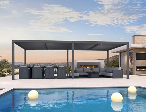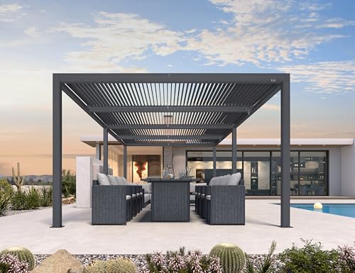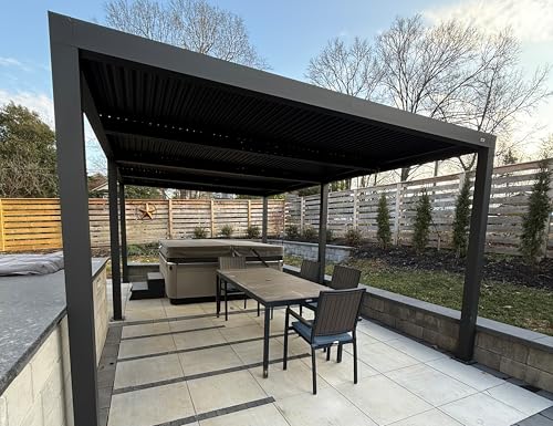 All-Aluminum Louvers: The pergola frame and louvers are modern dark gray, powder-coated aluminum. All-aluminum shutter? no more worrying about the shutter opening and closing jams due to rust, guarantees frequent silky smooth operation.