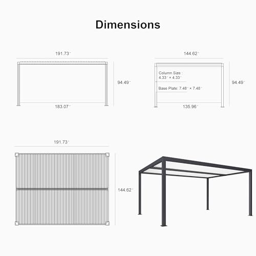 Strong All-Aluminum Frame: This patio pergola features a high-strength all-aluminum frame that’s waterproof, rust-resistant, and built to withstand harsh weather. It can endure wind speeds up to 73 MPH, ensuring stability and durability.
