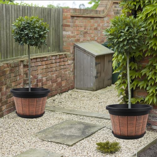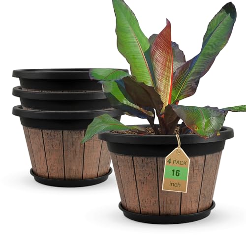 ?????Vintage Design?4 Pack 16 inch large outdoor planters adopt vintage style to match your home decor, the rugged look and faux wine barrel design complements many different decorative styles. You can feel this peaceful rustic comfort when planting in your garden or front yard.