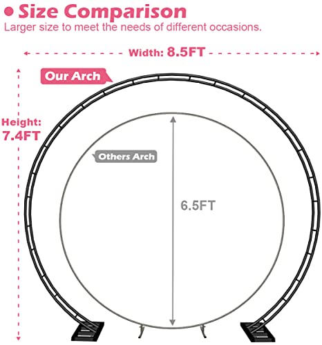 ?Extra Large Dimension? The circle backdrop stand is equiped with 16 double arch-shape tubes and 2 metal bases, they can be assembled to an extra-large size up to 8.5ft Wide x 7.4ft High, that means easily accommodate two or even three people cross the arch at the same time. Comes with 4 arch pegs and 2 sandbags, these accessories allow you to fix the arch stronger and keep from falling. (Note: Without flowers and Balloon in the package.)