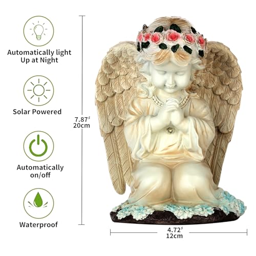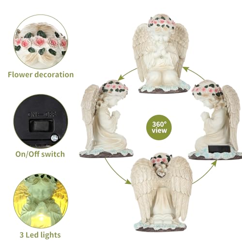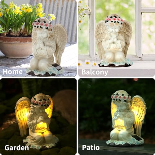 Durable and Waterproof: The solar angel statue is made of resin, hand-painted, features beautifully crafted wing details, and flowers. It can withstand most weather, snow, rain, and sunshine, and is IP44 rated.