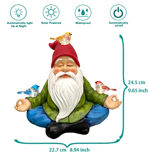 Gnome Solar Garden Light - Add vibrant color to your backyard - this relaxed meditating Gnome sitting in lotus pose holding 3 birds , all birds are Solar powered , lights up at night.