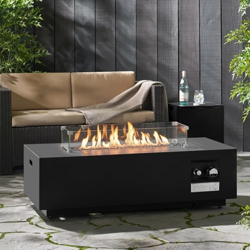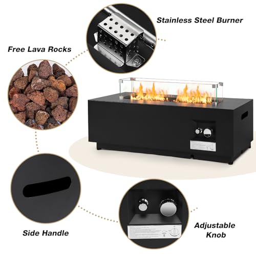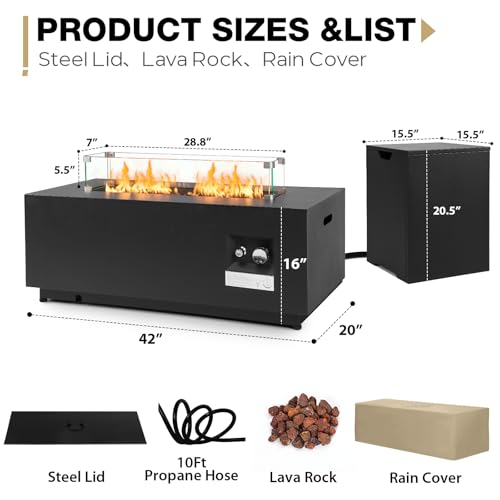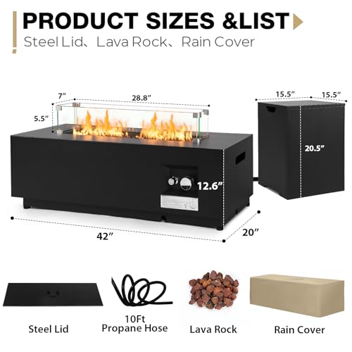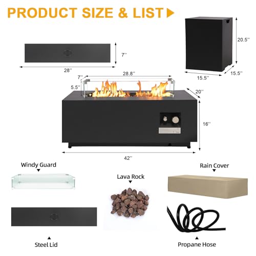 ?Black Iron Material?Upgrade 42”large modern fire pit table, stainless steel burner with integrated ignition to provide the most sufficient flame. Design with steel lid, free switch from FIRE PIT TABLE to flat intact COFFEE TABLE.