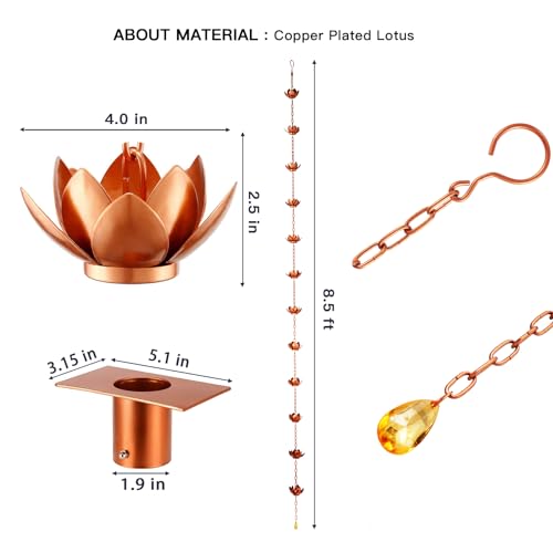 ?Beautiful Your House?The lotus rain chains is a beautiful and unique way to decorate your house, garden, patio, courtyard, villa, etc. The rain catcher chain is designed to catch rainwater that flows into a basin below, creating a soothing sound and providing a calming effect.