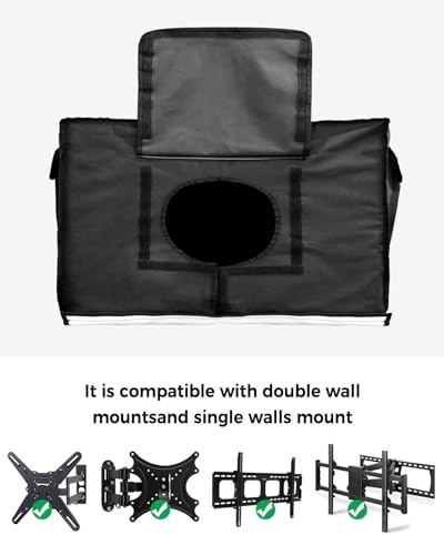 Easy to Install: This tv outdoor cover has slits on both sides of the bottom and areas in the back so the wall mount arm can fit through. The hook and loop back areas and the bottom work great to totally enclose the TV. You can effortless and quick to put on and remove this outdoor tv protector, nicely to protect your TV from the elements