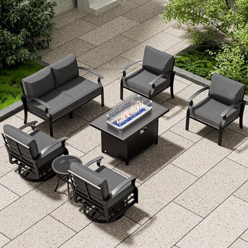 OUTDOOR FURNITURE: Aluminum patio furniture set has a total of 1 double seat armchair, 2 single seat armchairs, 2 swivel rocking chairs, a coffee table and a fire pit table. Patio furniture set has a variety of chairs for different scenarios of gatherings. It is a very nice thing to gather with your loved and friends in a festive atmosphere.