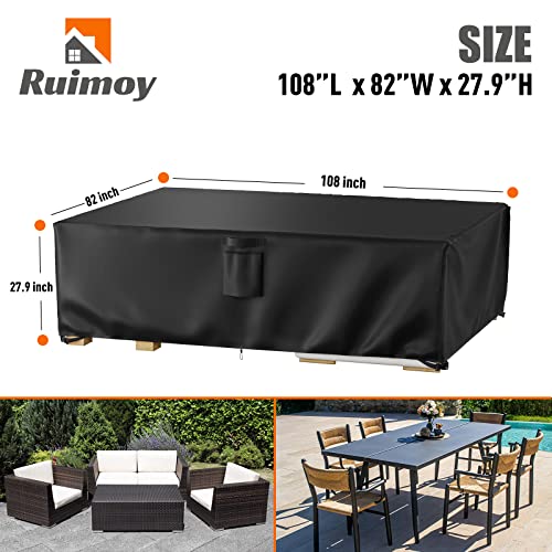 ?Universal Size?This cover measures 108 inches x 82 inches x 27.9 inches . It fits most furniture such as coffee tables, benches, coffee tables, chairs, round or oval patio dining sets, 8-12 chairs, or 6-8 person sofa sets. Please measure the size of your furniture set before purchasing.