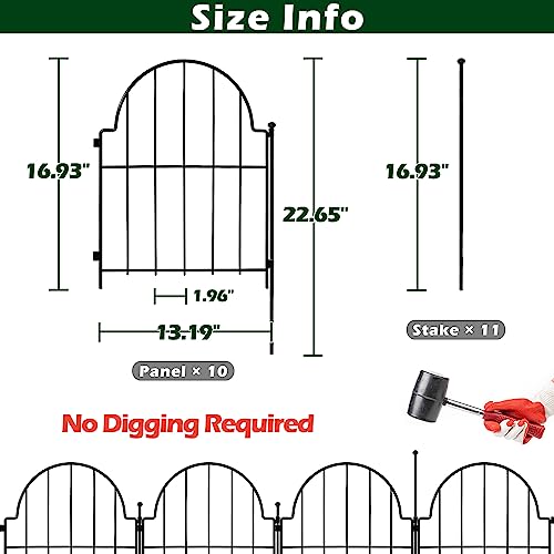 ?No Digging Required? Each fence panel measures out to be 16.93" high and 13.19" wide with a 16.93" stake, 10 panels & 11 stakes in total; Connect all 10 panels to create a 130"/10.83ft fence; Total height of the fence is 22.65". With the help of your mallet or hammer, just place the panels together by passing the stakes through the eyelets into ground, then join the panels together. It's important to hammer it in about 6" deep to ensure the stake is well supported and secure.
