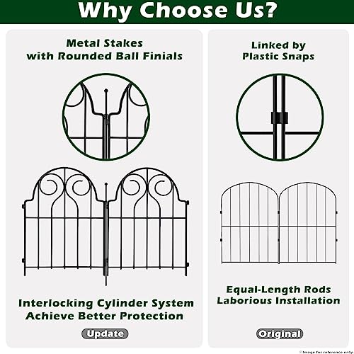 ?Durable Iron Construction? The fence panels and stakes are made of premium Iron material with a powder-coated finish, which helps to prevent chipping, rust and withstand the rigors of time and weather, therefore it will last for years to come. Professional welding technology strength the construction to avoid being damaged by small animals. Standing just 1.4 ft high, it is tall enough to fence in your plants without blocking the view.