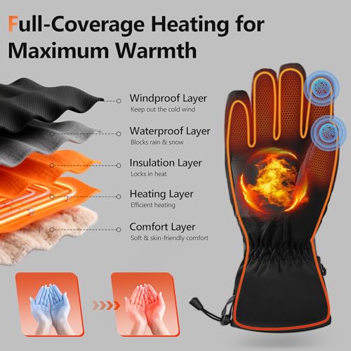 ?Waterproof, Windproof & Anti-Slip Design?Engineered with a fully waterproof shell, these heated hunting gloves keep your hands dry even in rain and snow. Their six-layer structure effectively blocks wind while locking in heat. Additionally, non-slip palm pads provide a secure grip on your phone and other essentials.