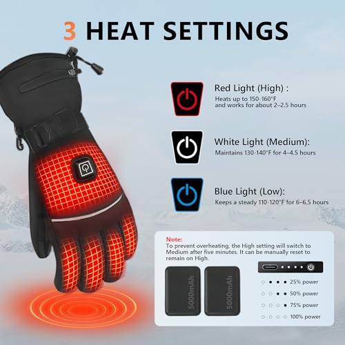 ?3-Level Adjustable Temperature for Customizable Heat?This portable heated gloves upgraded to use heating elements covers whole back of hand and fingers. Press the button to easily switch 3 temperature levels: High (red light, 149°F), Medium (white light, 122°F), and Low (blue light, 113°F), enabling you to customize the temperature and duration to match your activities.