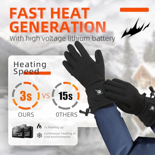 ?Long-Lasting Rechargeable Battery?:Rechargeable gloves Powered by 7.4V 2200mAh rechargeable batteries, providing up to 6 hours of continuous heat. With 3 heat settings, you can easily adjust warmth levels for changing temperatures.Extra batteries can be purchased separately to extend your heating time during long outdoor sessions