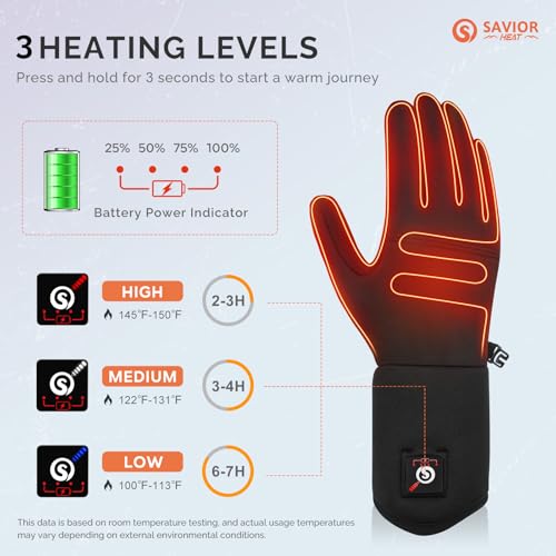 ?Upgraded Full Hand and Fingertip Heating? These rechargeable glove liners feature advanced heating elements that cover the entire back of your hands and extend to your fingertips,providing uniform and efficient warmth. The heating levels can be easily adjusted with a single press of the power button,allowing you to customize the temperature to your comfort.Perfect for indoor use and light outdoor activities like driving,Typing,Photography,walking,jogging,or working in cold storage.