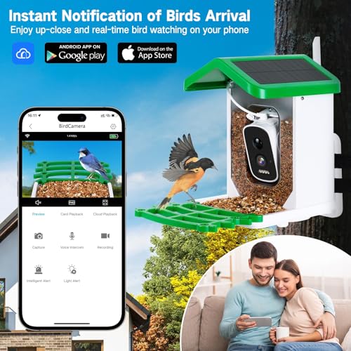 Cloud Storage & AI Recognition: Store your birdwatching memories with up to 128GB TF card support or cloud storage. The AI-powered bird feeder with camera can recognize over 10,000 bird species worldwide, offering a unique bird watching experience. While the AI is highly accurate, occasional errors may occur. The squirrel alert feature ensures your feeder is reserved for birds only.