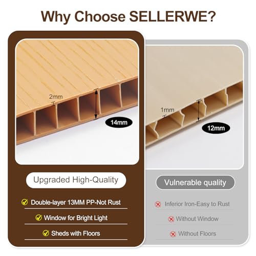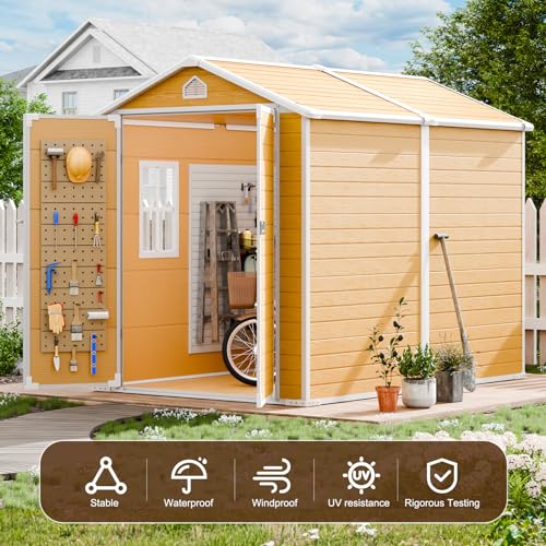 ?PREMIUM MATERIAL STORAGE SHED WITH FLOOR?: The 14mm tough double-wall resin construction, 0.6 mm galvanized steel frame and impact-resistant floor are designed for long-term durability. The double-wall panels are waterproof and moisture-proof, allowing worry-free use in all weather conditions. It is weather-resistant, waterproof, and UV-resistant-no peeling, rotting, or rusting. The screws are embedded to ensure aesthetics and safety.