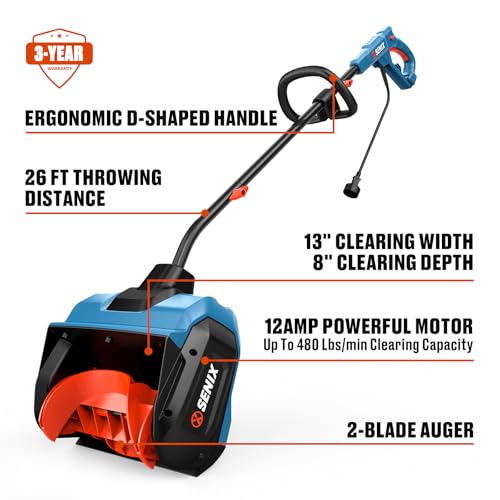 ?High-Efficiency Snow Removal?Tackle winter's worst with ease! This electric snow thrower features a high-performance 12-Amp motor and a dual-blade auger that moves up to 480 lbs of snow per minute. Quickly clear your driveway, sidewalk, deck, and patio without the strain of manual shoveling.