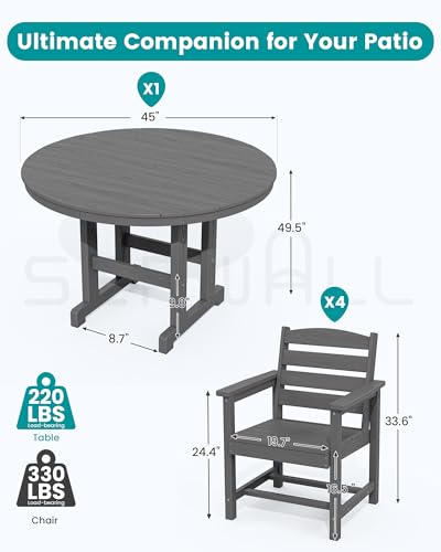 [5-Piece Dining Chair Set] This SERWALL HDPE patio dining set includes one round dining table and four dining chairs. The 45-inch round dining table offers ample space for meals or gatherings, making it perfect for outdoor dining for four.