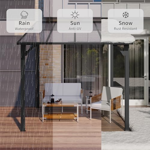 ?High-quality Material?This gazebo features high-quality polycarbonate roof shades that reflect 95% of UV rays, providing excellent UV protection.(Blocks UV rays without blocking light.) With a load capacity of up to 50 lbs/m2, this outdoor gazebo can withstand heavy snow, rain, and severe weather. For optimal performance, securely fasten the patio awning to the wall and ground, and can withstand wind speeds up to 38 mph and snow depths of 4 inches.