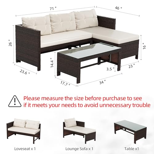 Outdoor Patio Sofa Dimension: This patio furniture set includes 1 loveseat, 1 lounge sofa with cushions and 1 coffee table. Loveseat: 47.2"L x 23.6"W x 26"H ; Lounge sofa: 46"L x 23"W x 26"H ; Coffee table: 34"L x 17.7"W x 14.4"H.