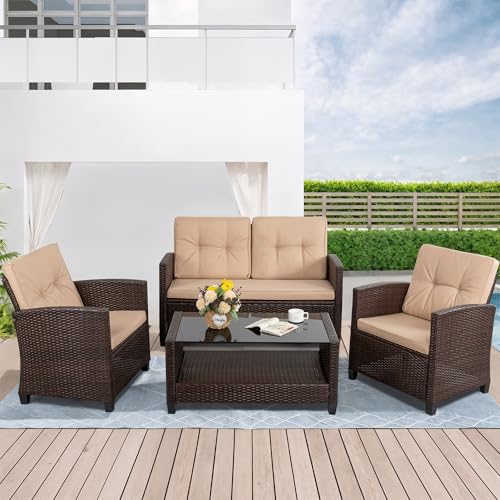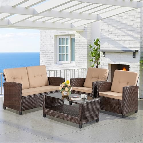 Handcraft Material?This patio furniture set is made of sturdy steel frame and hand woven PE rattan wicker. This 4 piece patio furniture is weather-resistant and won't rust or fade. No doubt this is a handsome outdoor furniture for your patio, garden, deck, or poolside.