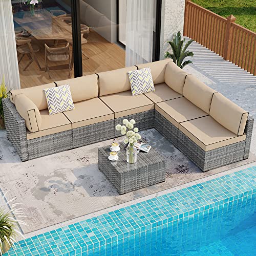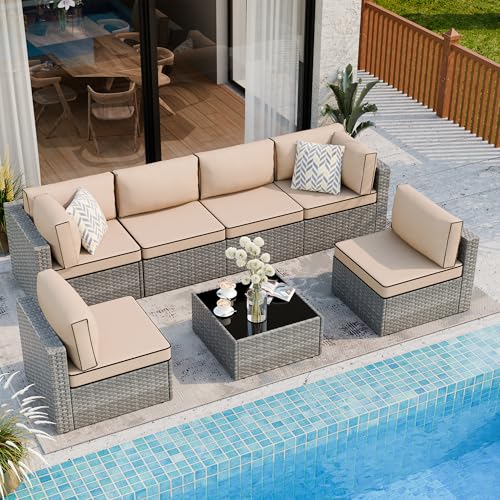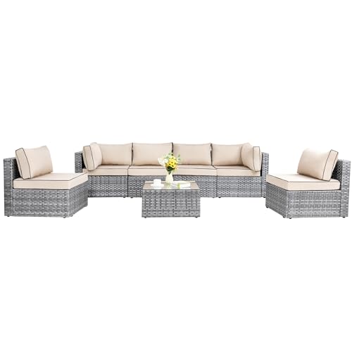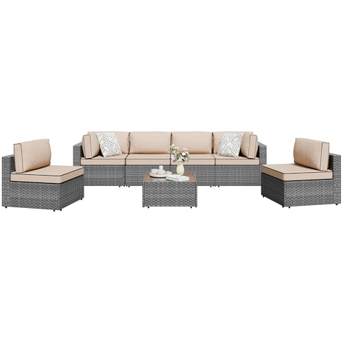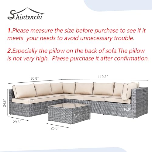 Sturdy&Durable: Solid metal structure make it super safe to sit in the sofa set. Added bars for the frame enhance the sturdiness and allow the sofa to support heavy people about 300lbs. Adjustable feet make it steady on uneven surfaces. PE Wicker is strong enough to survive inclement weather and guarantee the set has a long service life.Note: cushions are not water-proof??When you don' t use it, advise you to take cushions inside or buy a cover for longer service time?