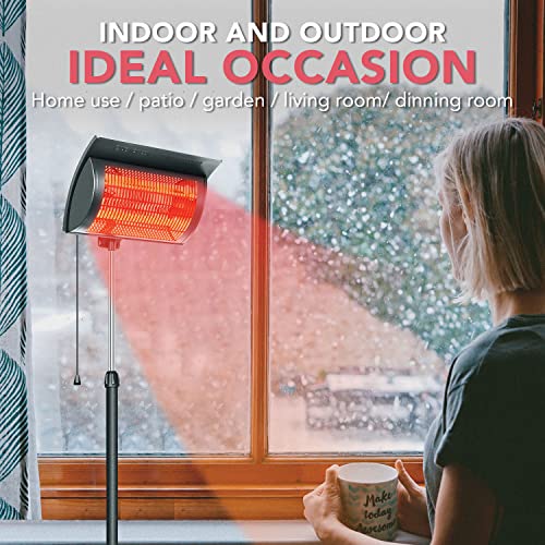 OUTDOOR & INDOOR USE: Simple Deluxe Electric Patio Heater is suitable for outdoor and indoor use. The Simple Deluxe Electric Patio Heater has 2 heat settings (750W/1500W)to meet your needs. High heat setting is more suitable for outdoor porches, balcony, and backyards. While low heat is ideal for indoors. Just place it anywhere you want and enjoy the warmth.