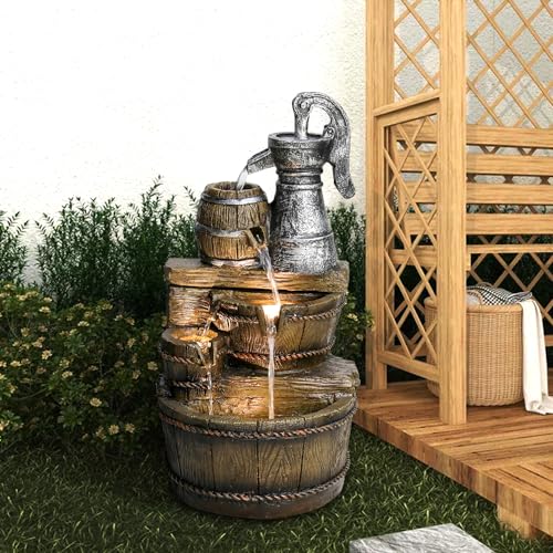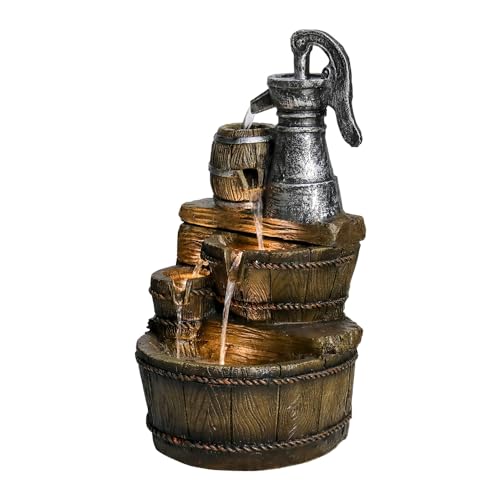 ?LED Patio Fountain?Built-in the concrete cascading floor garden waterfall feature is warm LED lights to illuminate traditional backyard water pump barrel fountain and the running waterfall feature in dim surrounding. Make your garden, patio, backyard, house and office more beautiful and fantastic. -Ideal Size: 12.9 x 12.9 x 25.5inch
