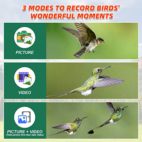 PIR automatic bird sensor: when a bird flies within 10m, the PIR motion sensor of the intelligent bird feeder will be triggered to automatically capture and save pictures or videos (set in advance according to requirements, memory card needs to be inserted), then the files can be transferred to a computer to view by transferring the memory card.