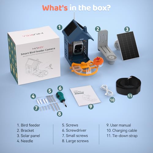 Suitable for All Seasons and Multiple Installation Scenarios: The MINIKEY Smart Bird Feeder Cam features a 1.25L capacity, with a funnel-style roof made of food-grade PE (IP65 waterproof). It comes with a mini hummingbird feeder for nectar to attract hummingbirds. The detachable tray simplifies monthly cleaning. Operating in -10? to 45?, it works year-round. With three mounting options (wall, tree, pole) and stable accessories, it creates safe habitats for birds anywhere